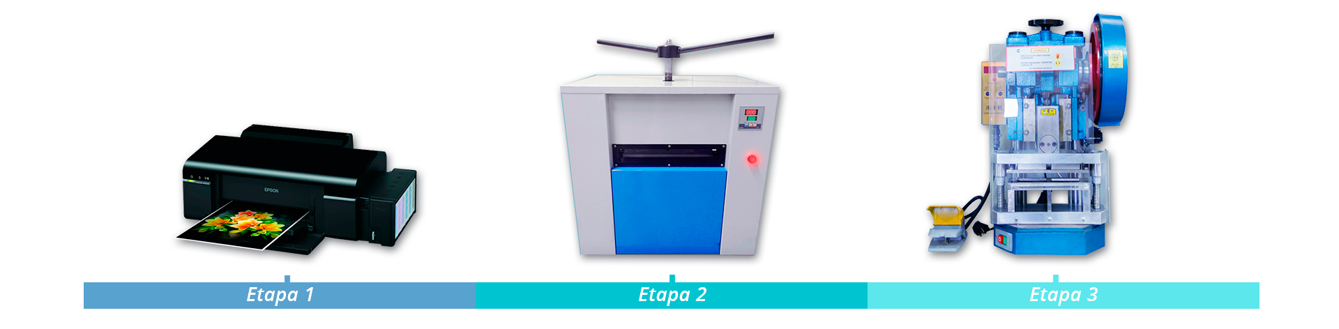 A primeira etapa se trata da impressão, em jato de tinta, dos crachás ou outros tipos de artes. Podemos citar como exemplo, todo tipo de placas de PVC, comandas, cartões de banco, carteirinhas, calendários e muitos outros.